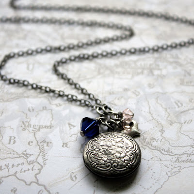 Annabelle is a small antique silver locket with floral engraving, hung with a small heart charm, a large dark indigo Swarovski crystal and two small peach Swarovski crystals. Originally I had designed it with a lighter blue crystal similar to the colour in the dress, however, the darker blue really brought out the peach shades and I think it will make more of an impact with the dress, not getting so lost in the pattern.